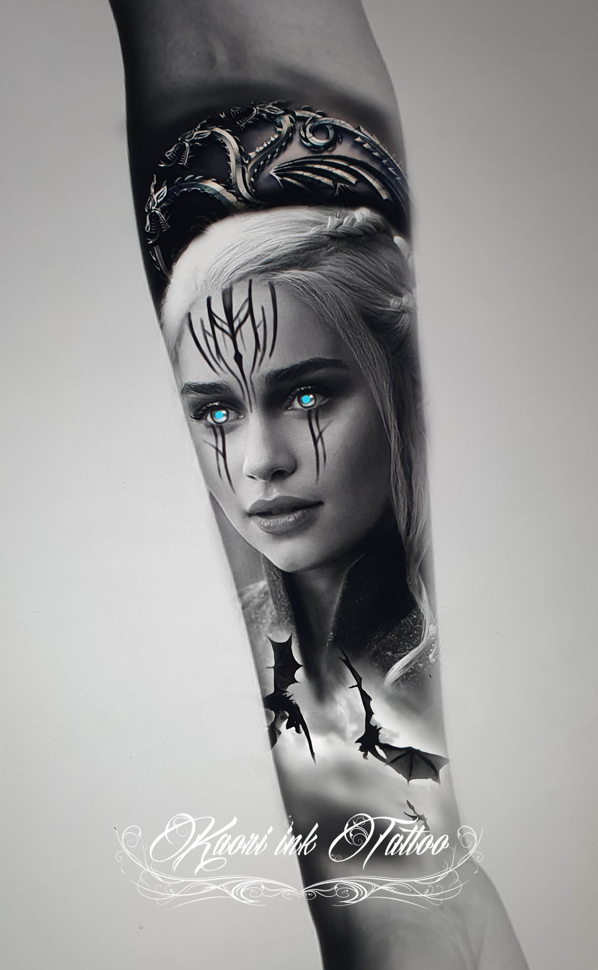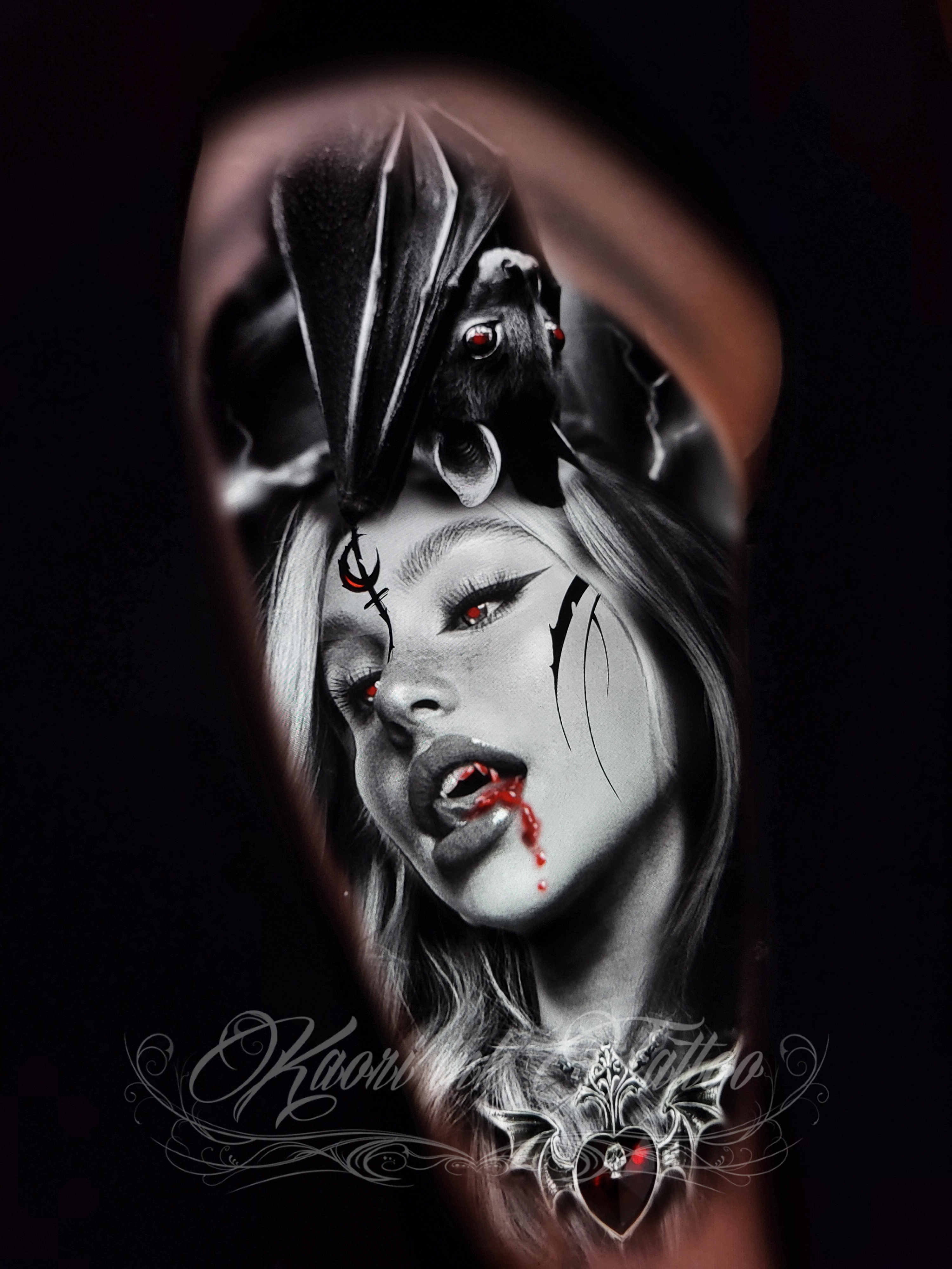 Mes oeuvres sont de style réalisme noir et gris (mixées à des pointes de couleur, à la demande); le tout agrémenté de motifs d’un style à part entière dans le monde du tatouage : le dark ornemental (ou dark lettering), motifs que l’on retrouve sur mes portraits. J’aime également ajouter une touche de mysticisme dans les regards.