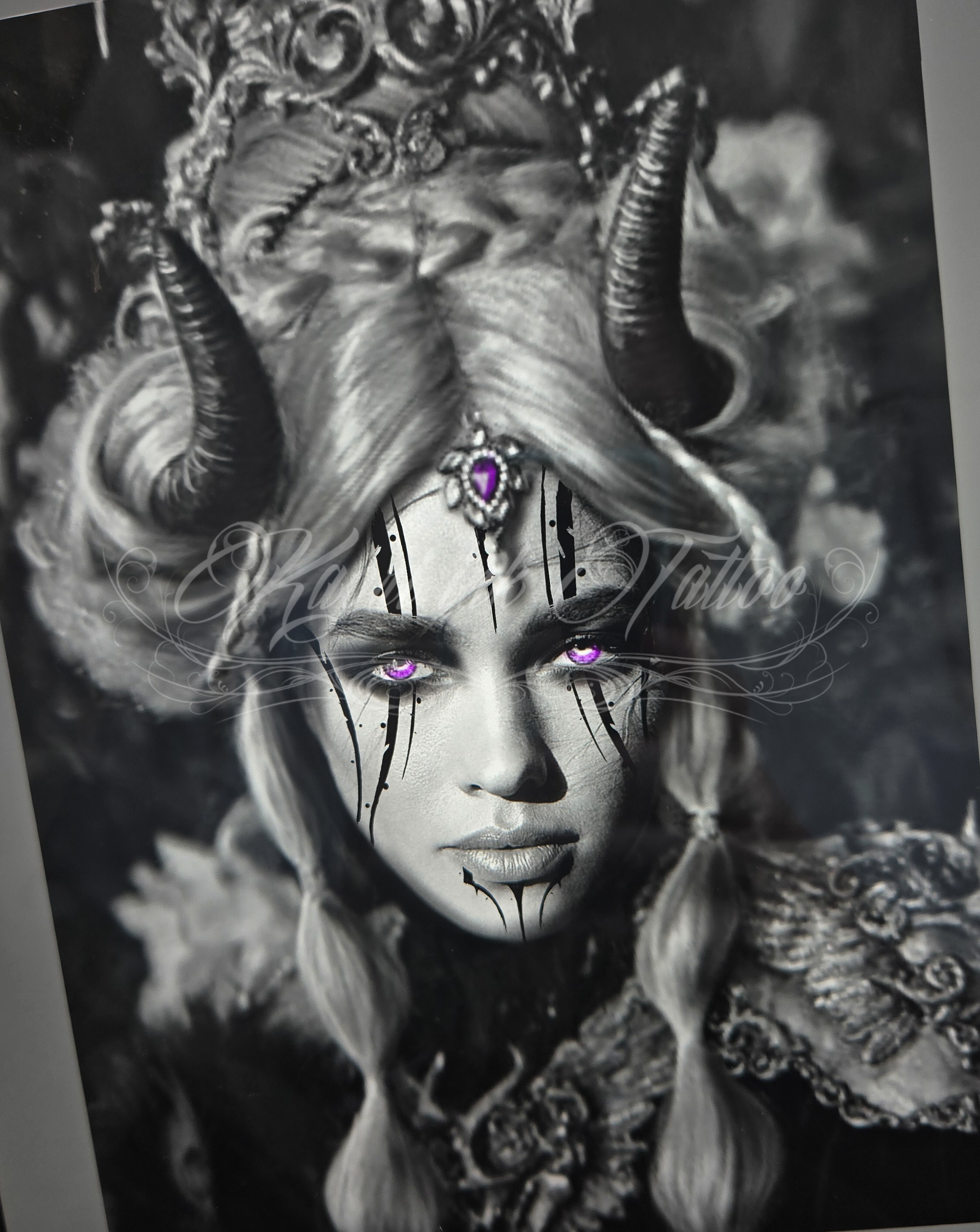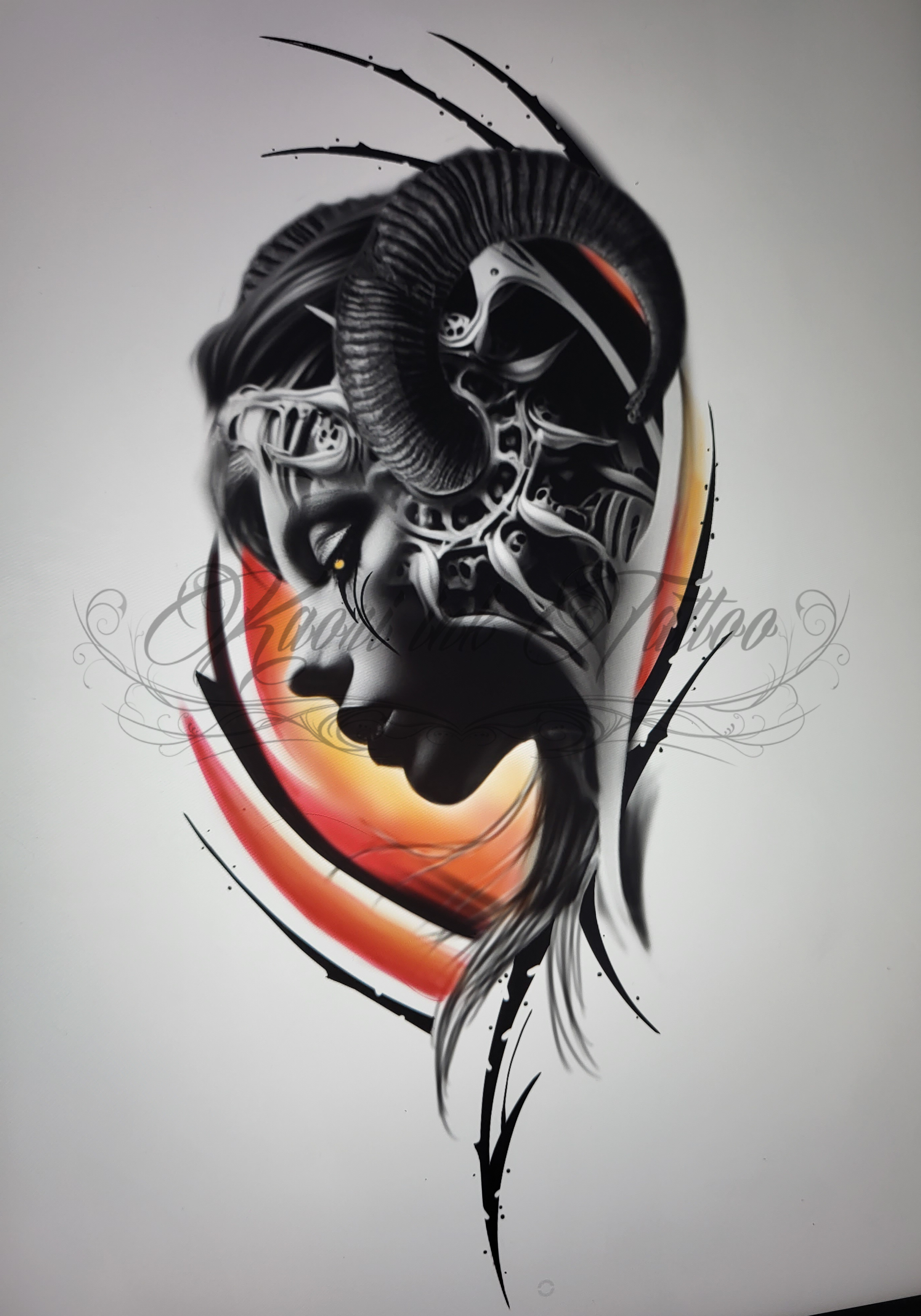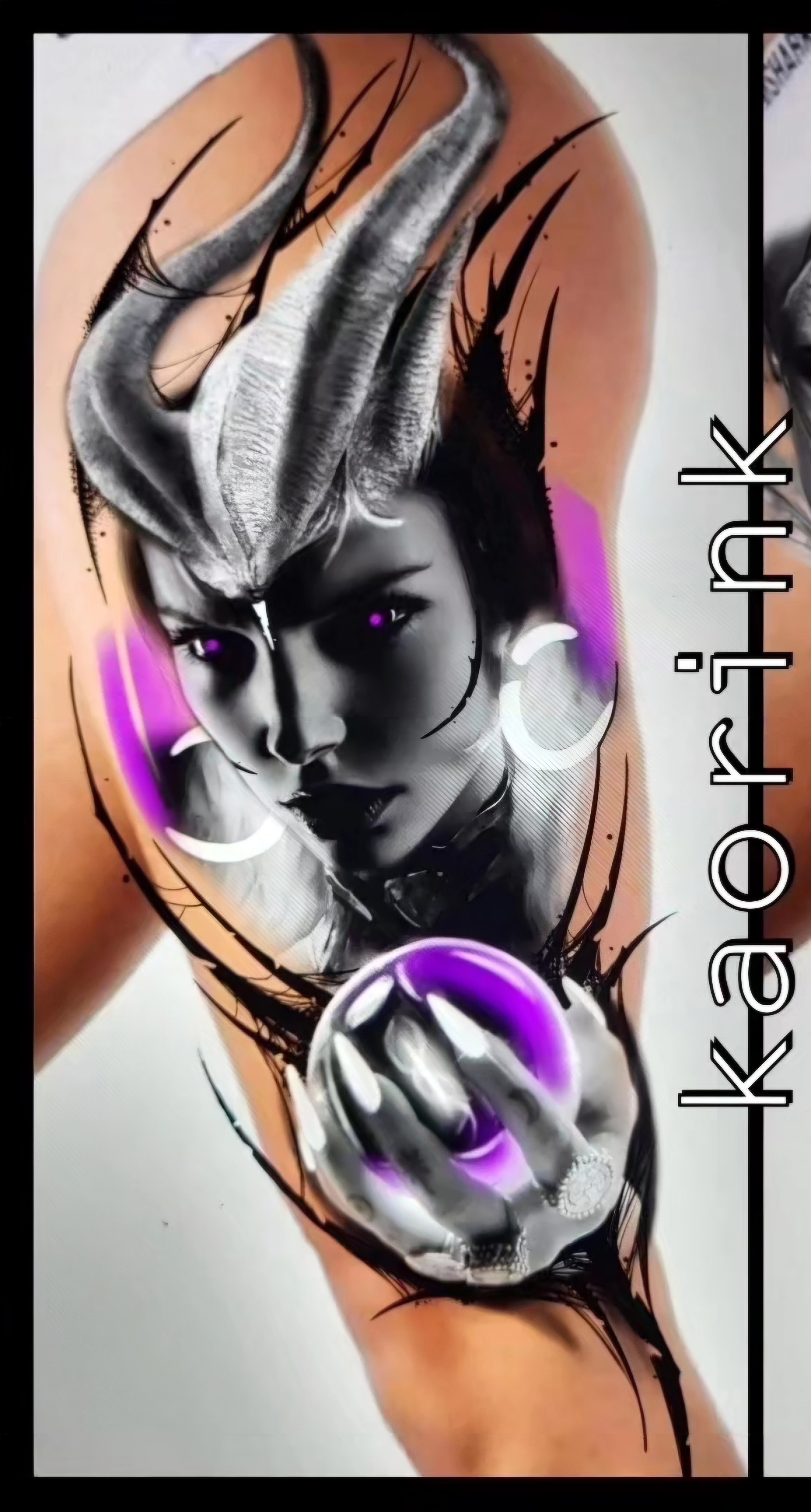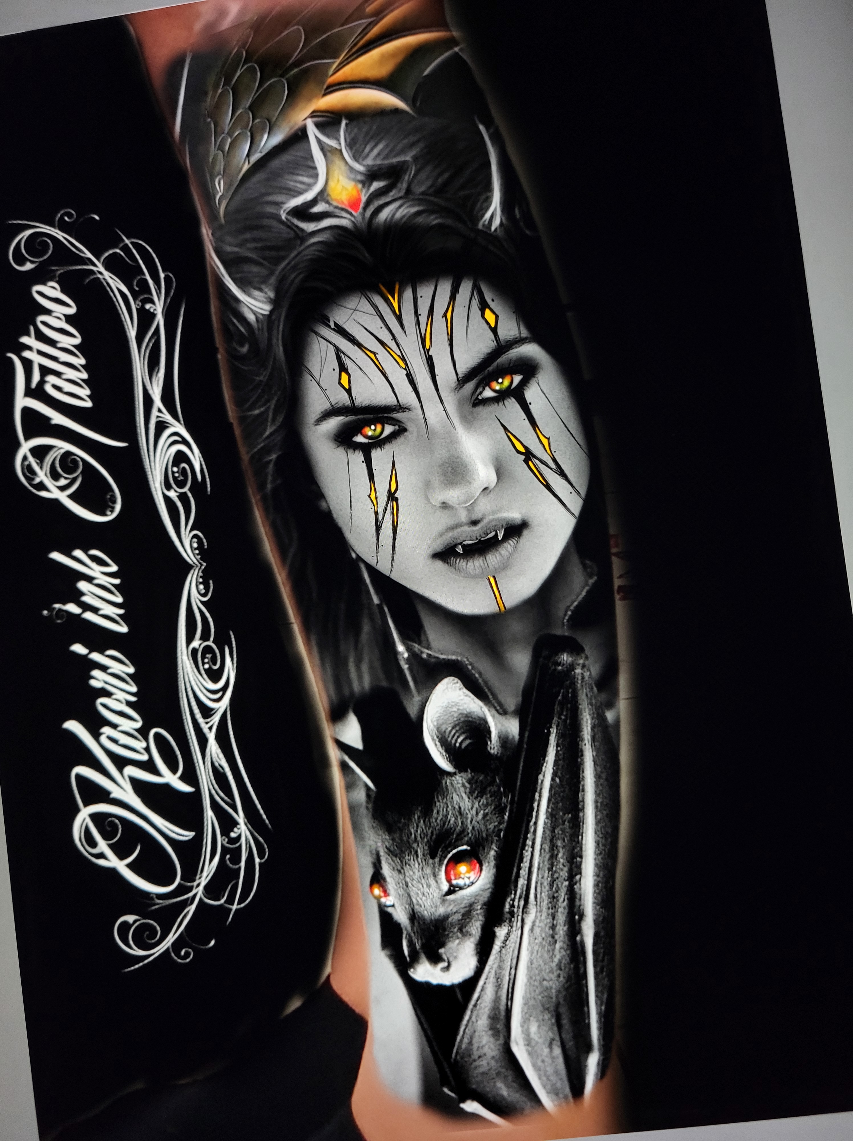 Donnez un thème / une idée globale sans trop détailler votre demande, afin de laisser un peu de marche de manoeuvre pour créer votre projet et ne pas être bloquée par trop de détails exigés (cela peut couper la créativité d’un artiste). Ma spécialité est en 1er lieu le portrait exclusivement féminin, j’ajoute ensuite différents éléments à la composition tels que des animaux, des paysages, du végétal ou univers dark (crâne de mort, autres). Je pratique également le dark lettering/dark ornemental seul, qui est un style assez récent dans le milieu du tatouage. N’hésitez pas à m’en demander, ça sera avec plaisir également.